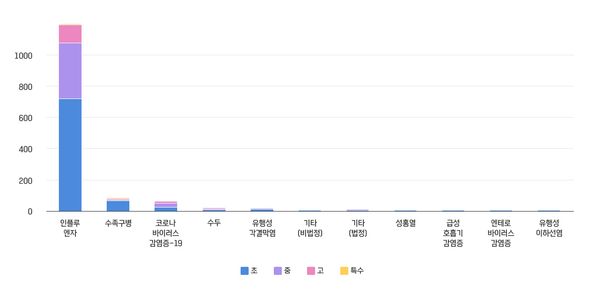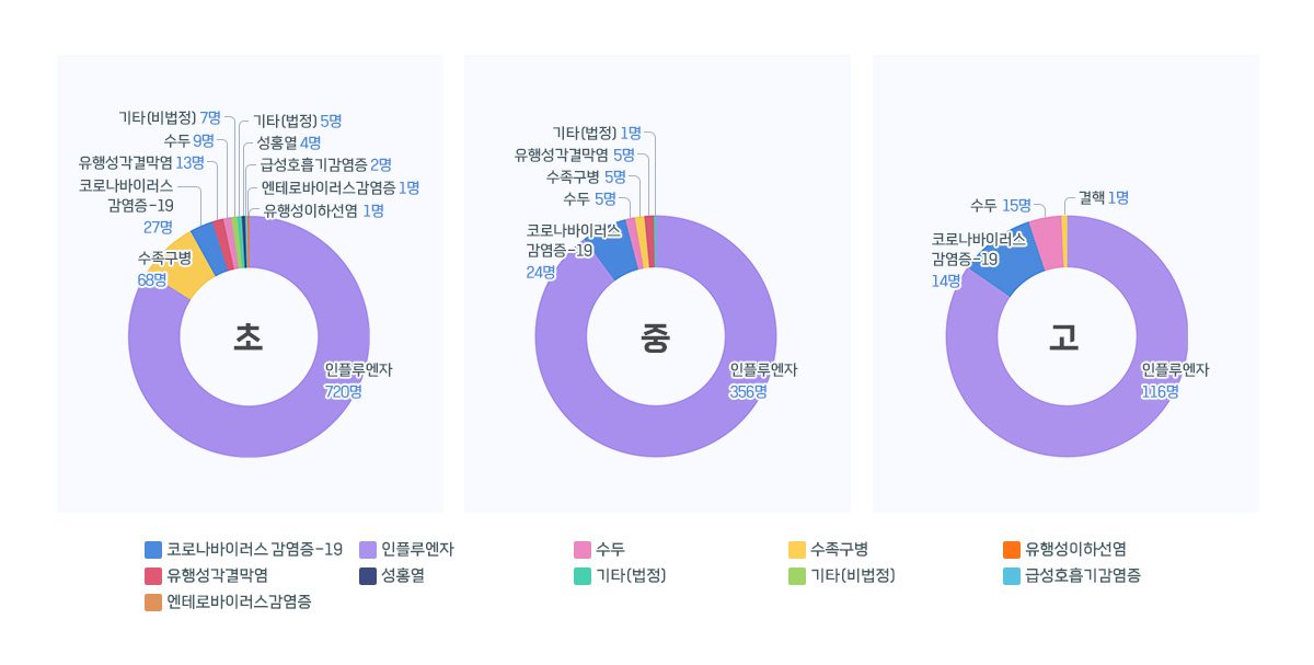 - 2025년 10월 학교 감염병 발생 현황을 보면, 인플루엔자(1,196명), 수족구병(77명), 코로나바이러스감염증-19(65명) 순으로 많이 발생하였다.