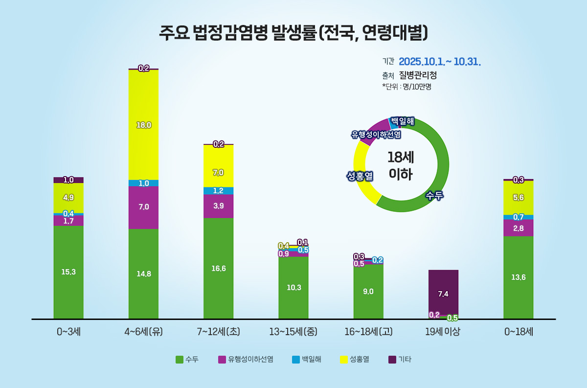 - 2025년 10월 1일부터 10월 31일까지 전국 감염병 발생 현황을 보면 총 5,289명(인구 10만명당 10.2명)으로 2025년 9월 8,621명(인구 10만명당 16.7명)보다 감소하였다. 연령별로 보면 18세 이하에서 23.0명(/10만명)으로, 19세 이상 8.1명(/10만명)에 비해 발생률이 높았다. 18세 이하 연령그룹을 나누어 보면 4-6세(유치원생)에서 41.1명(/10만명)으로 감염병 발생률이 가장 높았고, 그 다음으로 7-12세(초등학생)에서 28.8명(/10만명), 0-3세에서 23.3명(/10만명), 13-15세(중학생)에서 12.2명(/10만명), 16-18세(고등학생)에서 10.0명(/10만명) 순으로 나타났다.