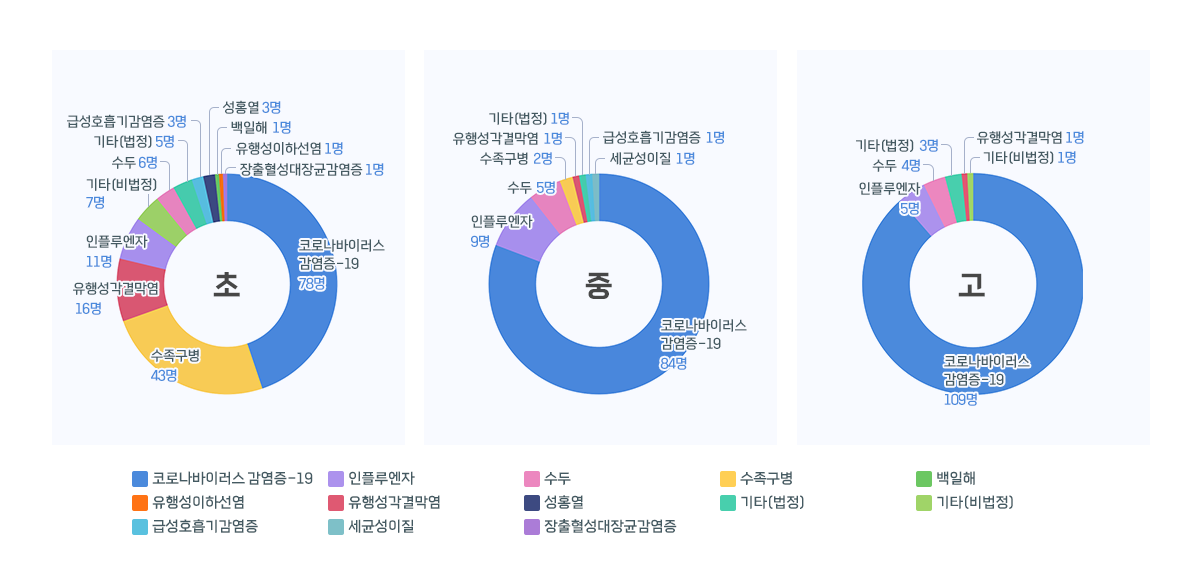 - 각 급 학생 인구 10만명을 기준으로 코로나바이러스감염증-19가 가장 많이 발생하였다. 고등학교에서 143.6명/10만명당(109명), 중학교에서 101.6명/10만명당(84명), 특수학교에서 100.3명/10만명당(2명), 초등학교에서 54.2명/10만명당(78명) 순으로 고등학교에서 발생률이 가장 높았다.
