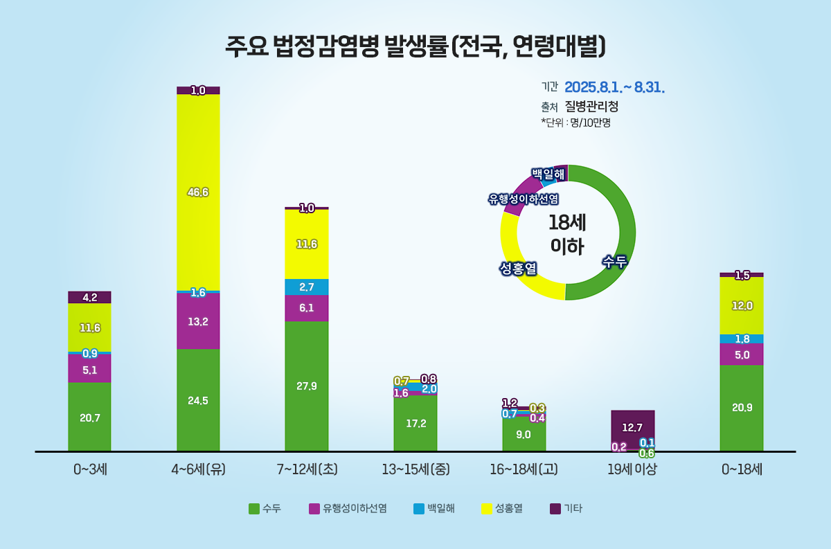 - 2025년 8월 1일부터 8월 31일까지 전국 감염병 발생 건수는 총 9,101명(인구 10만 명당 17.6명)으로, 2025년 7월 11,122명(인구 10만 명당 21.5명)에 비해 감소하였다. 연령별로 보면 18세 이하에서 41.2명(/10만명)으로, 19세 이상 13.7명(/10만명)에 비해 발생률이 높았다. 18세 이하 연령그룹을 나누어 보면 4-6세(유치원생)에서 87.0명(/10만명)으로 감염병 발생률이 가장 높았고, 그 다음으로 7-12세(초등학생)에서 49.3명(/10만명), 0-3세에서 42.4명(/10만명), 13-15세(중학생)에서 22.3명(/10만명), 16-18세(고등학생)에서 11.7명(/10만명) 순으로 나타났다.