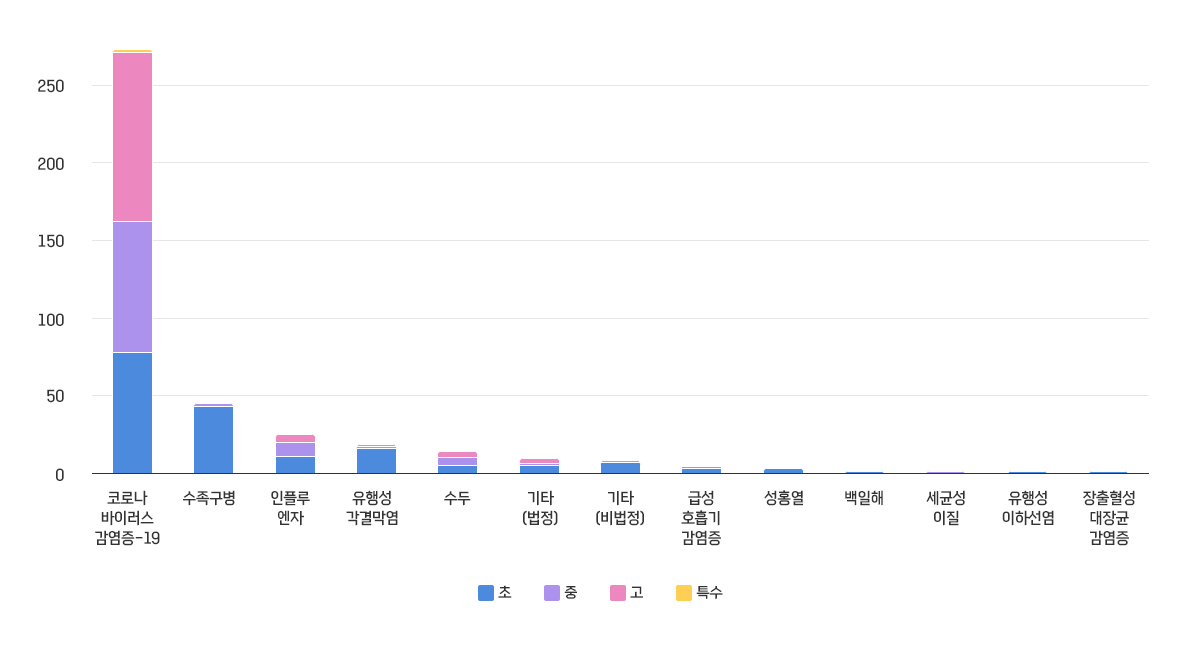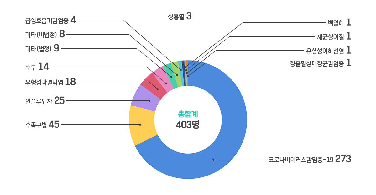 - 주요 발생 감염병은 코로나바이러스감염증-19(273명)이었으며, 수족구병(45명), 인플루엔자(25명) 순으로 많이 발생하였다.