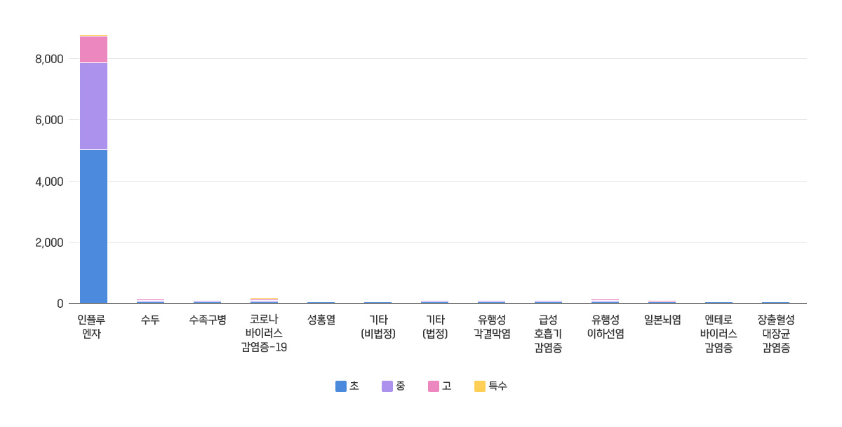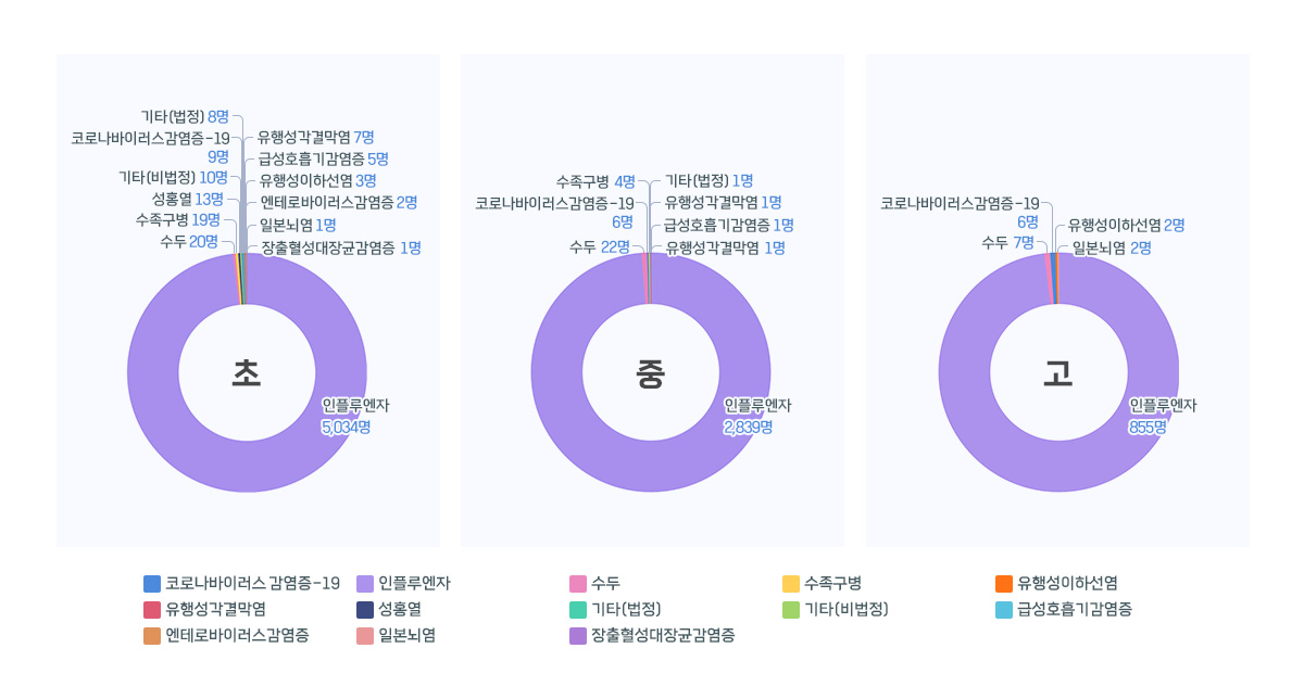 - 2025년 12월 학교 감염병은 인플루엔자(8,765명), 수두(49명), 수족구병(23명) 등 순으로 많이 발생하였다.