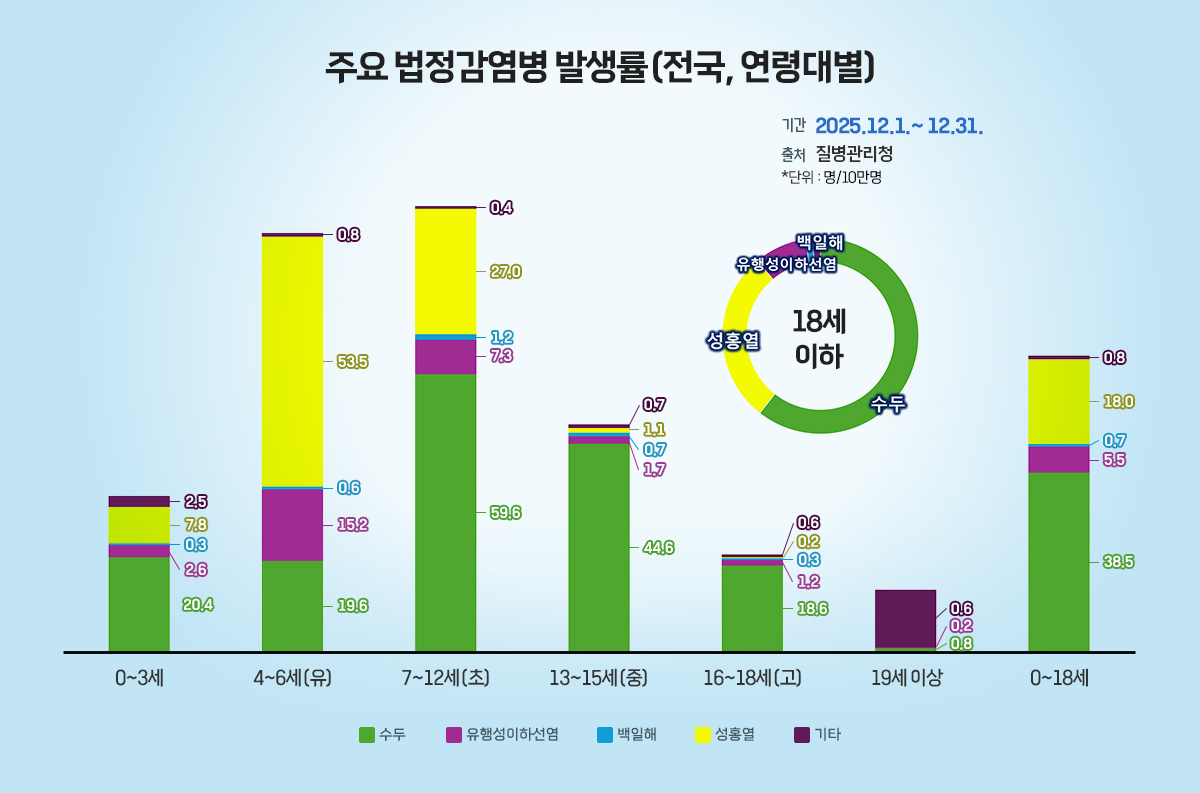 - 2025년 12월 1일부터 12월 31일까지 전국 감염병 발생 현황을 보면 총 10,607명(인구 10만명당 20.5명)으로 2025년 11월 10,534명(인구 10만명당 20.4)과 비슷하였다. 연령별로 보면 18세 이하에서 63.5명(/10만명)으로, 19세 이상 13.4명(/10만명)에 비해 발생률이 높았다. 18세 이하 연령그룹을 나누어 보면 7-12세(초등학생)에서 95.5명(/10만명)으로 감염병 발생률이 가장 높았고, 그 다음으로 4-6세(유치원생)에서 89.8명(/10만명), 13-15세(중학생)에서 48.7명(/10만명), 0-3세에서 33.6명(/10만명), 16-18세(고등학생)에서 20.9명(/10만명) 순으로 나타났다.