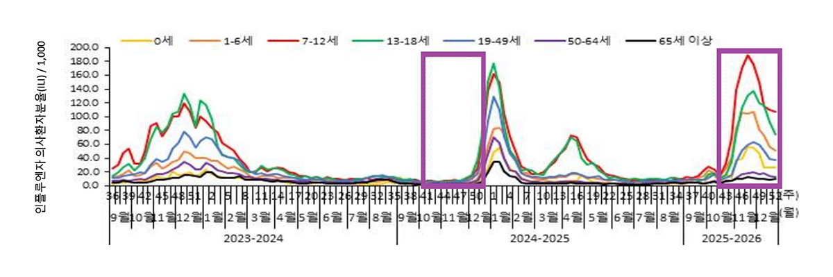 2025년 52주차(12.21.~12.27.) 인플루엔자 의사환자분율*은 37.5명(/1,000명)으로 전주(39.1명) 대비 감소, 전년도 동기간 (73.9명) 대비 낮은 수준이며, 연령별로는 7~12세(107.3명), 13~18세(75명) 순으로 발생