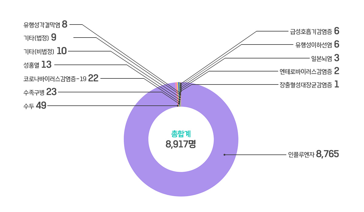 - 이와 함께 코로나바이러스감염증-19(22명), 성홍열(13명), 유행성각결막염(8명), 유행성이하선염(6명) 등도 발생하였다.