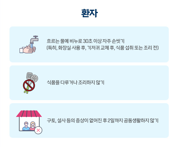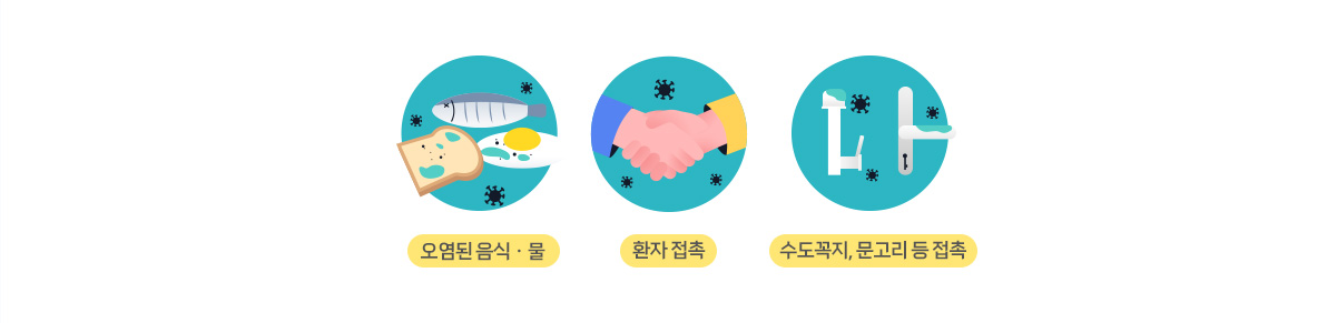 또한, 노로바이러스는 소량만으로도 감염될 수 있어 노로바이러스에 감염된 환자가 손을 씻지 않고 만진 수도꼭지, 문고리 등을 손으로 만진 후 입을 만지거나 음식물 섭취 시 감염될 수 있습니다.