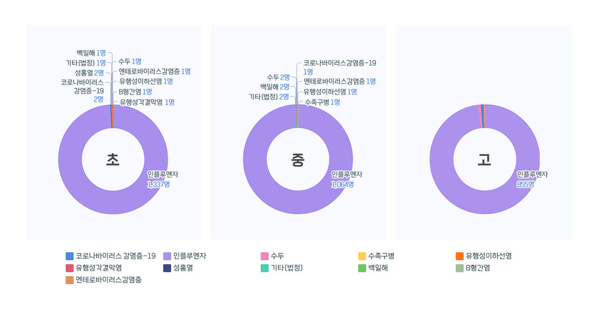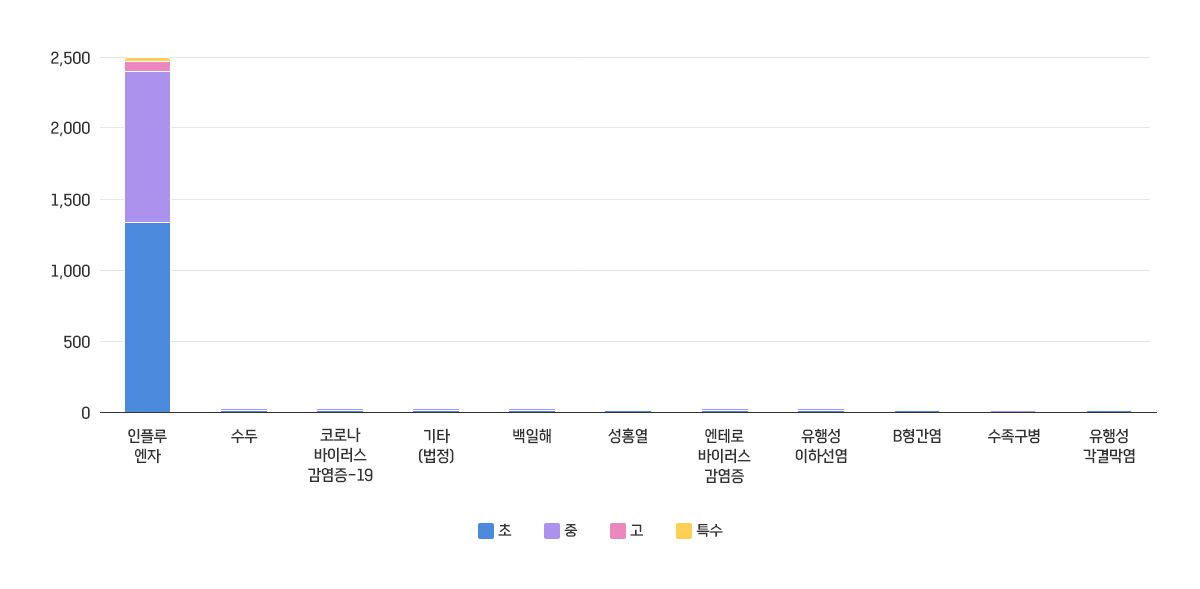 - 2026년 1월 학교 내 감염병 발생 현황은 인플루엔자(2,496명)가 가장 많았으며, 이어 수두(3명), 백일해(3명), 코로나바이러스감염증-19(3명), 성홍열(2명), 엔테로바이러스감염증(2명), 유행성이하선염(2명) 순으로 보고되었다.