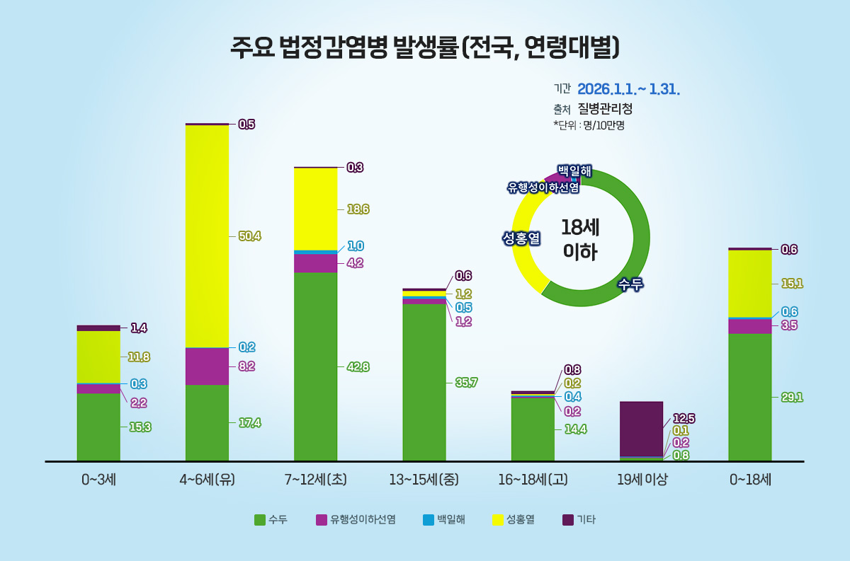- 2026년 1월 1일부터 1월 31일까지 전국 감염병 발생 현황을 보면 총 9,587명(인구 10만명당 18.5명)으로 2025년 12월 10,607명(인구 10만명당 20.5명)보다 감소하였다. 연령별로 보면 18세 이하에서 48.6명(/10만명)으로, 19세 이상 13.6명(/10만명)에 비해 발생률이 높았다. 18세 이하 연령그룹을 나누어 보면 4-6세(유치원생)에서 76.8명(/10만명)으로 감염병 발생률이 가장 높았고, 그 다음으로 7-12세(초등학생)에서 66.9명(/10만명), 13-15세(중학생)에서 39.3명(/10만명), 0-3세에서 31.0명(/10만명), 16-18세(고등학생)에서 16.1명(/10만명) 순으로 나타났다.