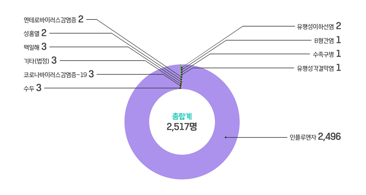 | 인플루엔자 | 발생수 | 2,496 | 1,337 | 1,064 | 70 | 25 |