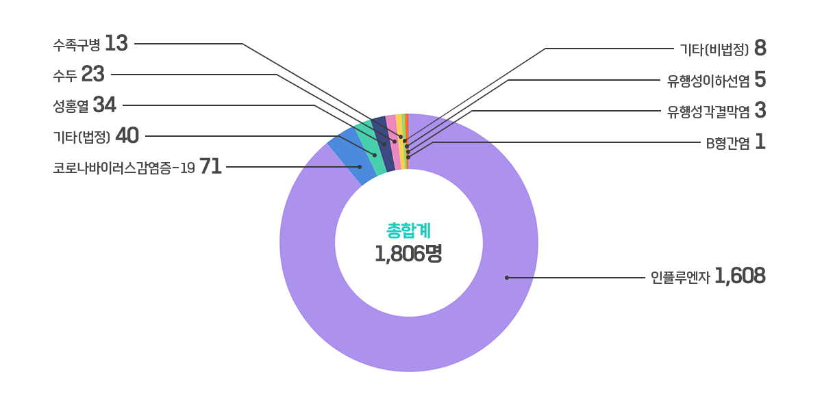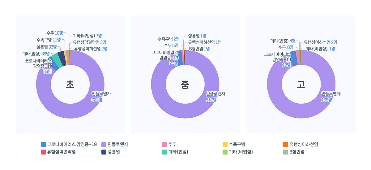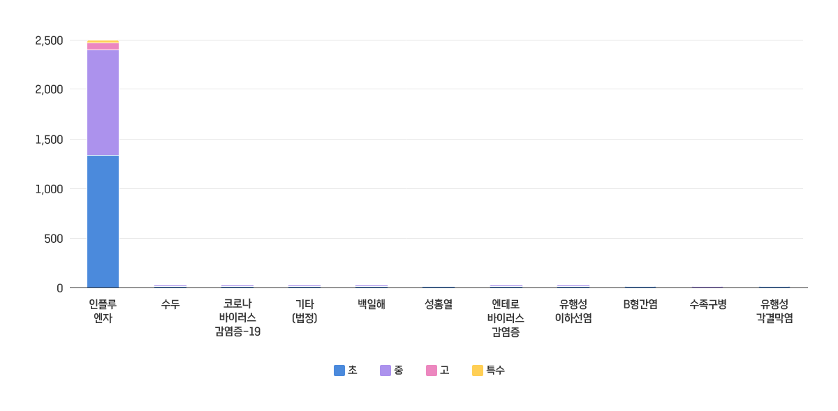 - 2026년 3월 교내 감염병은 인플루엔자(1,608명)가 가장 많이 발생하였으며, 코로나바이러스감염증-19(71명), 성홍열(34명), 수두(23명), 수족구병(13명) 등도 발생하였다.