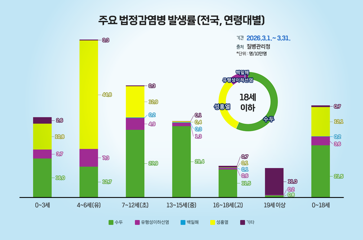 - 2026년 3월(3월 1일~31일) 전국 감염병 발생자는 총 8,157명(인구 10만명당 15.8명)으로, 2월 7,063명(인구 10만명당 13.6명)에 비해 다소 증가하였다. 연령별로 보면 18세 이하에서 37.9명(/10만명)으로, 19세 이상 12.1명(/10만명)에 비해 발생률이 높았다. 18세 이하 연령 그룹을 나누어 보면 4-6세(유치원생)에서 65.1명(/10만명)으로 감염병 발생률이 가장 높았고, 그 다음으로 7-12세(초등학생)에서 46.2명(/10만명), 0-3세에서 33.1명(/10만명), 13-15세(중학생)에서 31.5명(/10만명), 16-18세(고등학생)에서 13.1명(/10만명) 순으로 나타났다.