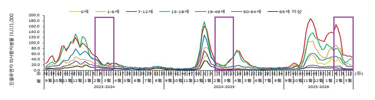 2026년 13주차(3.22.~3.28.) 인플루엔자 의사환자분율*은 16.3명(/1,000명)으로, 전주(17.6명) 대비 감소, 전년도 동 기간(16.3명) 대비 동일한 수준이며, 연령별로는 7~12세(47.5명), 13~18세(41.6명) 순으로 높은 발생률을 보임